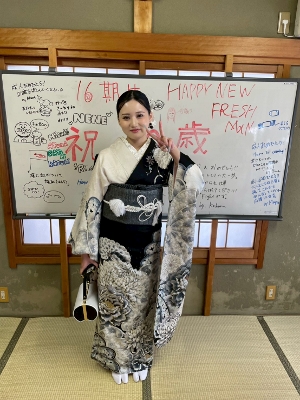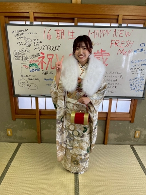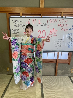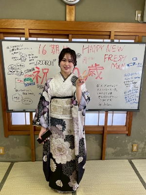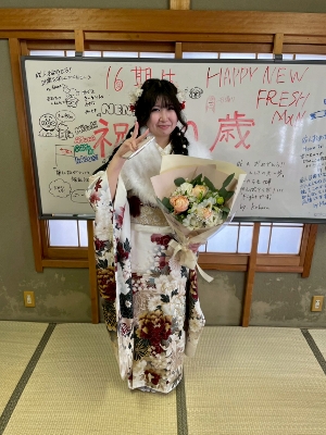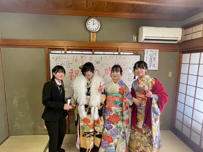 2026.1.12 成人式 16期生が成人式後に挨拶に来てくれました。久しぶりに会えた子もよく顔を出してくれる子も晴れ姿を見られてうれしかったです。これからの活躍を期待しています。また、会いに来てください!