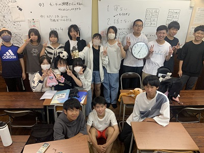 2025.8.9~10 徹夜学習 今年も夏休みに中学生を対象に徹夜学習を行いました。 今年は三年生だけでなく一、二年生も多く参加してくれました。 みんな限界まで挑戦し、最後はみんなで記念撮影。 みんなよくがんばりました。